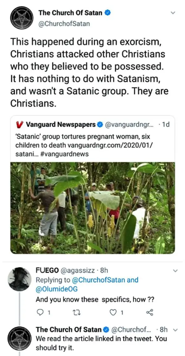 The news article was about the exorcism of a pregnant woman who didn't survive the process and the death of six children alongside. When vanguard published this article and shared on Twitter reffering to the group as "Satanic group" the church of Satan quickly retweeted and corrected the use of the word "Satanic" and said that it was in fact a group of Christians that carried out the act and committed the crime.